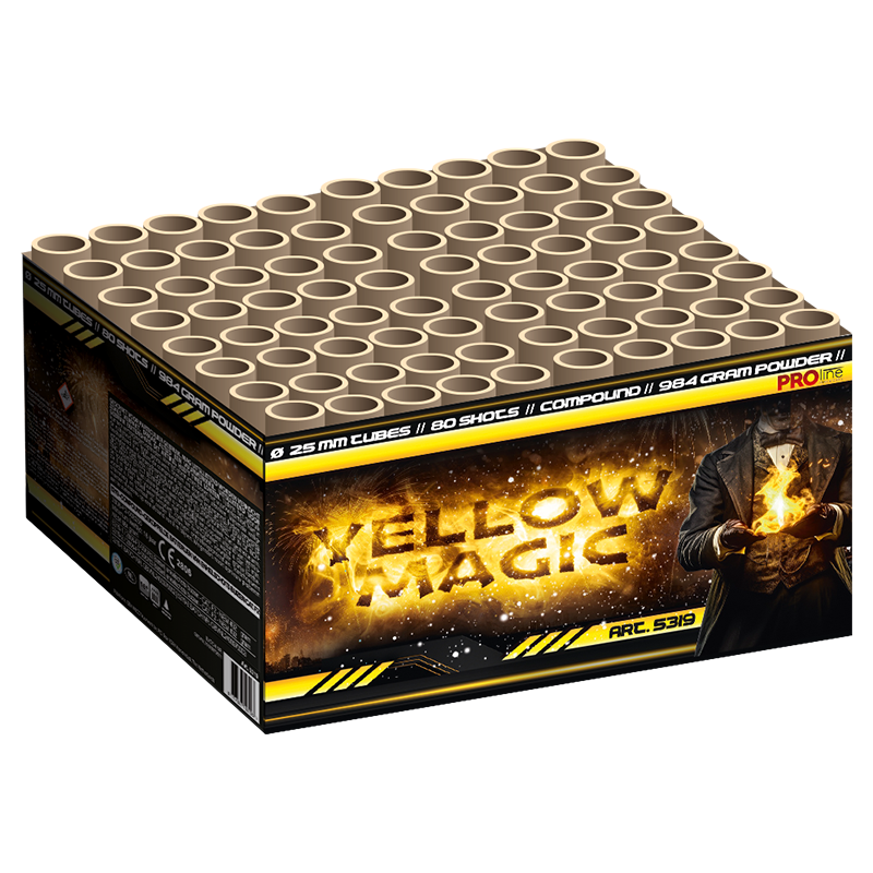 Yellow Magic, 80 shots 25mm compound. Prachtige gouden willow palmen, knetter spider/dahlia, brocade crowns met gekleurde toppen en blinkers, gevolgd door een spectaculaire willow to moving stars finale!